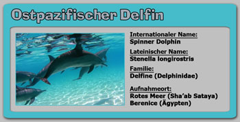Der Ostpazifische Delfin, auch Spinnerdelfin genannt, kann bis zu 230 cm groß und 80 kg schwer werden. Die Oberseite dieser Tiere ist dunkelgrau, am Bauch sind sie cremeweiß gefärbt. Am Schwanzansatz, auf dem Rücken und am Hals sind zudem dunkle Flecken möglich. Charakteristisches Merkmal ist ihre lange, schmale Schnauze mit einer dunklen Spitze. Außerdem verfügen sie über eine dreieckige Rückenfinne.