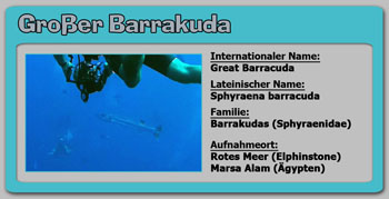Das große Maul ist das Markenzeichen des Großen Barrakuda. An den Seiten verfügen diese grundsätzlich silberfarbenen Tiere oftmals über zahlreiche dunklere Querstreifen. Die Schwanzflosse ist gegabelt und kann, vor allen Dingen bei Jungfischen, schwarze Bereiche aufweisen. Große Barrakudas können bis zu 2 Meter lang werden. Im Normalfall beschränkt sich ihre Größe im ausgewachsenen Stadium jedoch auf ungefähr 140 cm.
