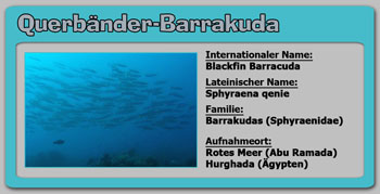 Der Querbänder-Barrakuda wird mit einer maximalen Länge von 170 sowie einer gewöhnlichen Größe von 80 cm wesentlich kleiner als sein großer Verwandter. Auch sein Kopf ist deutlich schlanker. Ausgeprägter sind dafür seine Seitenstreifen, die quer über die gesamte Seite gehen. Seine Schwanzflosse schimmert schwarz. Jungtiere schwimmen oft in großen Schulen (siehe Foto).