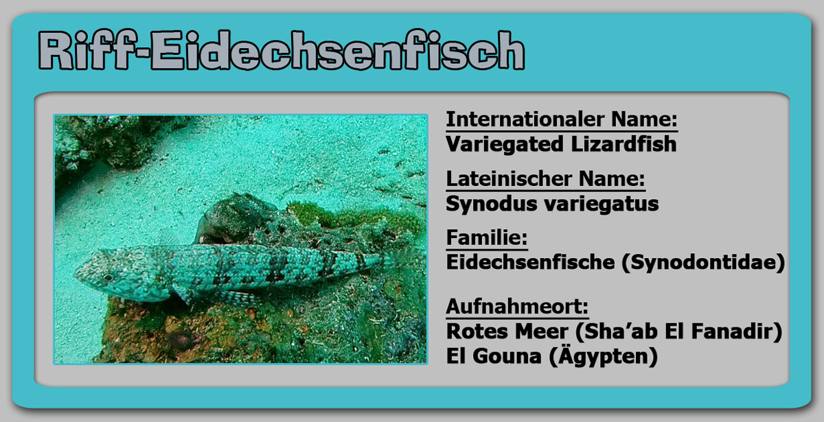 Riff-Eidechsenfische sind von hell- bis dunkel- sowie rotbraun gefärbt und verfügen an den Seiten über einen Streifen aus dunklen Rechtecken, die sich in einer Linie von der Brustflosse bis zum Schwanzansatz ziehen.