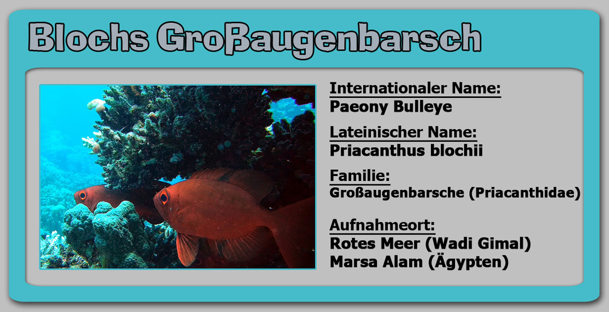 Ansonsten sind beide Tiere grundsätzlich rotgefärbt. Bei Blochs Großaugenbarsch kommen zusätzlich auch rot-braune bis silbrig schimmernde Farbgebungen vor, die dieser Fisch auch je nach Gemütslage verändern kann.
