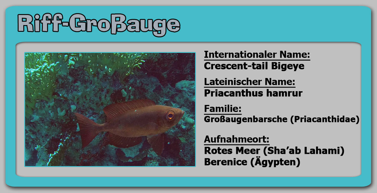 Das Riff-Großauge, auch 'Gewöhnlicher Großaugenbarsch' genannt, ist ein roter Fisch, der jedoch auch mit silbrigen Querstreifen auftritt. Je nach Stimmung kann er Farbe und Muster verändern. An seinen Seiten unterhalb der Rückenflosse können kleine linienförmig angeordnete schwarze Punkte auftreten. Die Flossen sind zudem oftmals dunkler bzw. kräftiger gefärbt.