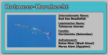 Der Rotmeer-Hornhecht schwimmt oftmals nah an der Wasseroberfläche, da er sich hier an Beutefische 'heranschleichen' kann. Sein Erkennungsmerkmal ist der spitze Kiefer, der wie ein Speer geformt ist. Der Bauch glänzt silbrig, der Rücken ist leicht grünlich gefärbt. Jüngere Fische verfügen manchmal zusätzlich über einen schwarz umrandeten Schwanz. Diese Färbung lässt jedoch mit zunehmendem Alter immer mehr nach.