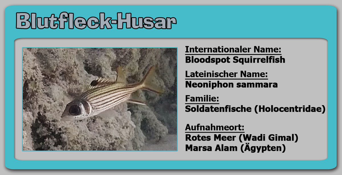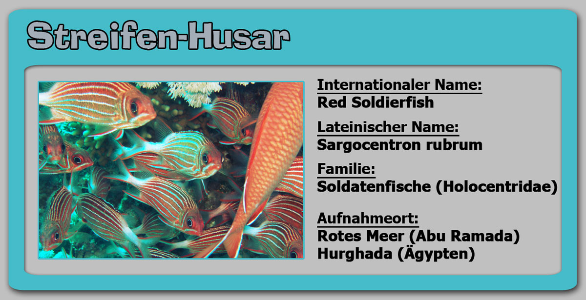 Der Streifen-Husar wird auch Roter Eichhörnchen- oder Soldatenfisch genannt. In der Tat sieht er seinen Artgenossen wie z. B. dem Weißsaum-Soldatenfisch sehr ähnlich. Deutliches Erkennungsmerkmal allerdings sind seine weißen Streifen, die von den Kiemen bis zum Schwanzansatz reichen. Ansonsten ist der Streifen-Husar rotgefärbt.