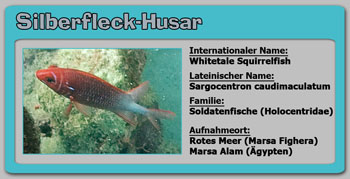 Auch der Silberfleck-Husar ist ein vornehmlich rot bzw. orange gefärbter Fisch. Der internationale Name dieser Art ist eigentlich angemessener als der deutsche: Die rote Farbe verblasst in Schwanzrichtung immer mehr, so dass die Tiere über einen weißen Schwanz verfügen.