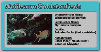 Der Weißsaum-Soldatenfisch ist ein vornehmlich roter Fisch mit einem sehr dünnen und dezenten weißen Rand an den Flossenspitzen. Auffallend ist sein gabelförmiger Schwanz. Weißsaum-Soldatenfische treten oft auch in großen Schulen auf.