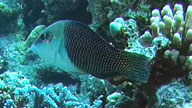 Adulte männliche Tiere sind einfarbig dunkelgrün über braun, grau-anthrazit bis hin zu schwarz. Sie verfügen über einen schwarzen und einen weißen Querbalken auf den Seiten, der sich bauchwärts auflöst. Mit zunehmendem Alter entwickeln diese Tiere einen Stirnbuckel (siehe Hauptfoto). Der Schwanzflossenhinterrand ist besenförmig gezackt.