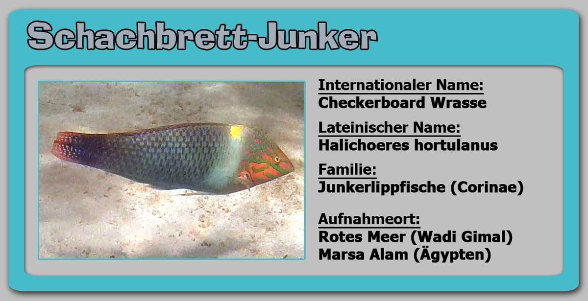 Charakteristisch für Schachbrett-Junker ist das auffällige Muster am Kopf, das z. B. rot auf grünem Untergrund oder auch gelb auf blauem Untergrund sein kann. Wie auch immer: Der Schachbrett-Junker ist in jedem Fall eine farbenfrohe Erscheinung.