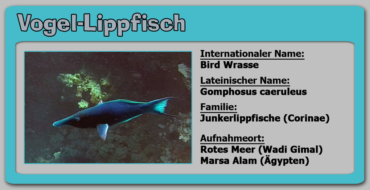 Der Vogel-Lippfisch hat seinen Namen von seinem schnabelförmig geformten Maul. Die Farbe dieses Fisches kann je nach geographischer Lage variieren. Adulte Tiere sind meistens dunkelblau bis Türkis gefärbt, können jedoch auch verschiedene Grünfarben haben. Juvenile Tiere sind heller und haben manchmal auch einen gelben Bauch und/oder einen braunen Kopf sowie ein weißes Maul.