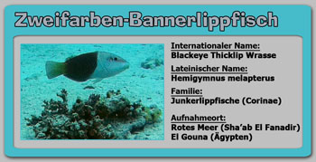 Der Zweifarben-Bannerlippfisch trägt seinen Namen lediglich in seiner Jugendzeit zu Recht. Juvenile Tiere sind vorne weiß und hinten grün, braun oder dunkelbraun bis hin zu schwarz gefärbt (siehe Fotos).
