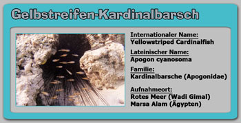 Gelbstreifen-Kardinalbarsche sind von Pselion-Kardinalbarschen, die eher im Norden des Roten Meeres vorkommen, nur sehr schwer zu unterscheiden! Einziges Unterscheidungsmerkmal ist der schwarze Fleck des Pselion-Kardinalbarsches am Schwanz, den der Gelbstreifen- Kardinalbarsch eben nicht aufweist. Ansonsten ein kleiner Fisch mit silbriger Grundfarbe sowie gelblich oder goldenen Längsstreifen.
