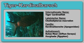 Die Grundfarbe des Tiger-Kardinalbarsches ist beige bzw. goldfarben. Vom Kopf bis zum Schwanz ziehen sich dunkelbraune Längsstreifen, die mit zunehmendem Alter immer größer und zahlreicher werden. Vor dem Schwanz enden diese Streifen abrupt, so dass hier eine helle einfarbige Stelle entsteht. Der Schwanz verfügt zudem oben und unten über einen dunklen Rand.