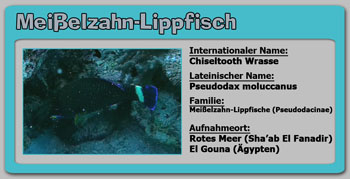 Meißelzahn-Lippfische können in sehr unterschiedliche Grundfärbungen von allen Brauntönen bis hin zu Schwarz vorkommen. Charakteristisch ist der weiße Balken an der Schwanzflosse, der sich mit zunehmendem Alter immer mehr ausprägt.