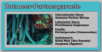 Die Rotmeer-Partnergarnele ist bis auf einige weiße und violette Flecken bzw. Punkte vollständig transparent. Sie wird bis zu 2,5 cm lang. Der lateinische Name 'Periclimenes longicarpus' ('lange Hand') bezieht sich auf ihr verlängertes zweites Beinpaar. Die Scheren sind im Verhältnis zum restlichen Körper sehr groß ausgeprägt.