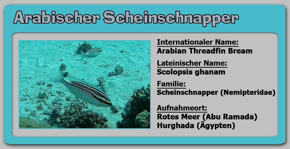 Bläulich silberfarbener Fisch mit zahlreichen schwarzen oder dunkelbraunen Punkten an den Seiten. Diese sind so angeordnet, dass sie im Bereich des seitlichen Rückens im Wechseln mit weißen Bereichen entsprechendfarbige Längsstreifen bilden. Diese Färbung ist vor allen bei Jungtieren sehr gut ausgeprägt (siehe unser Foto) und verblasst mit zunehmendem Alter. Ein dickes schwarzes Band führt zudem über die Augen bis über die Oberlippe.