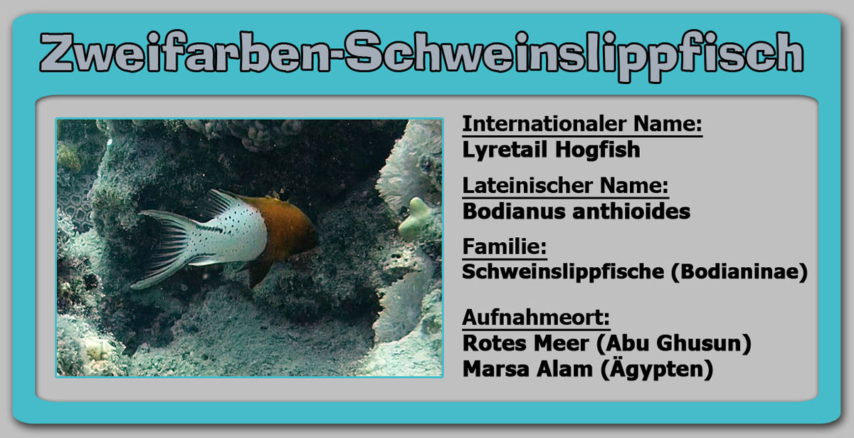 Der Zweifarben-Schweinslippfisch ist zweifarbig. Während der vordere Teil normalerweise bronzefarben ist oder aus mehreren Brauntönen besteht, ist der hintere Teil des Fisches leuchtend weiß.