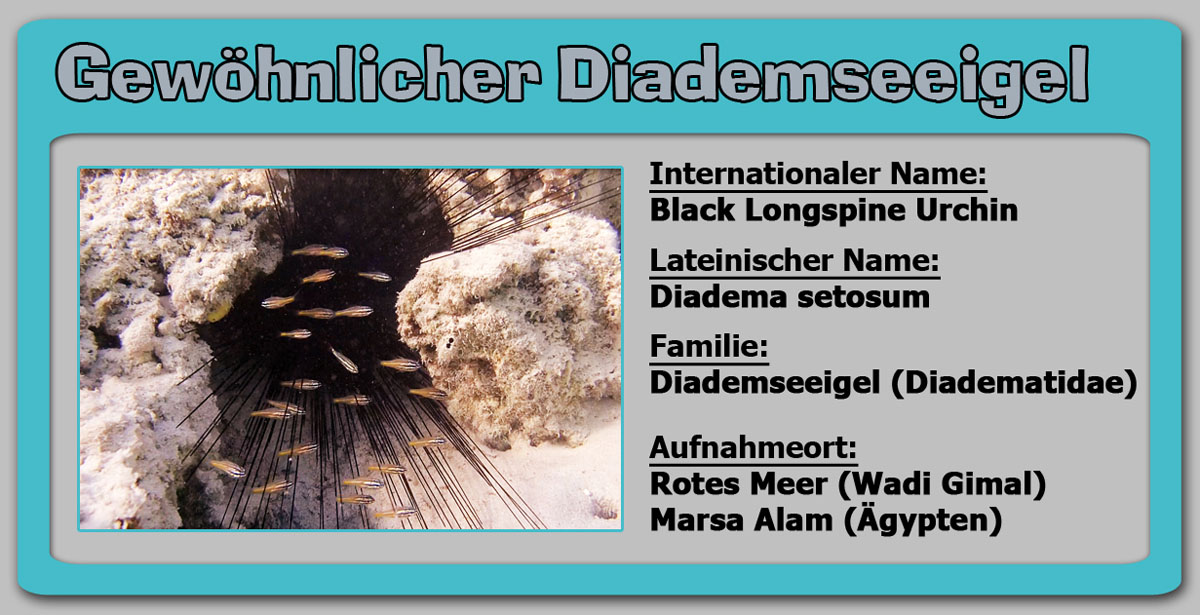 Der Gewöhnliche Diademseeigel verfügt über besonders lange Stacheln, die bis zu 30 cm lang werden können. Sie sind sehr spitz, dünn und innen hohl, so dass sie leicht abbrechen, wenn man mit ihnen in Kontakt kommt. Die meisten Tiere sind vollständig schwarz gefärbt. Teilweise können sie jedoch grünlich schimmern. Außerdem gibt es auch graue sowie weißlich und braun geringelte Exemplare.