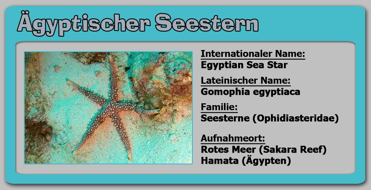 Ägyptische Seesterne sind braun, rot, rosa oder orange gefärbt und verfügen über konische Dornen am ganzen Körper. Diese können im gleichen Farbspektrum, aber deutlich heller bis hin zu weißlich gefärbt sein. Zwischen den Dornen sind zudem schwarz umrandete Flecken möglich, die aus der Ferne betrachtet ebenfalls wie Dornen aussehen. Ägyptische Seesterne verfügen über fünf Arme, die im Querschnitt rund geformt sind.
