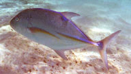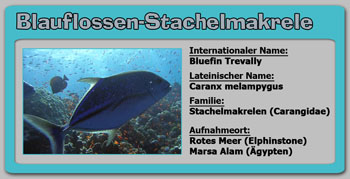 Die Blauflossen-Stachelmakrele ist vornehmlich silberfarben und hat blaue Bauch-, Rücken und Schwanzflossen. Die gebogenen Brustflossen schimmern zumeist gelblich.