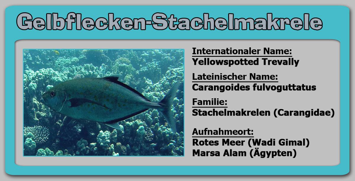 Wie fast alle ihre Verwandten ist auch die Gelbflecken-Stachelmakrele vornehmlich silberfarben. An ihren Seiten verfügt sie über gelbe Flecken. der seitliche Rücken kann zudem leicht gelblich schimmern. Gleiches gilt für die Schwanzflosse, die sogar vollständig gelb erscheinen kann.