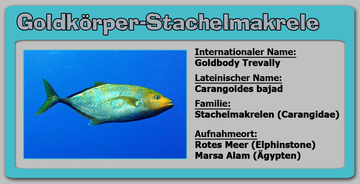 Die Goldkörper-Stachelmakrele hat nicht immer, wie man vielleicht denken mag, den genannten goldfarbenen Körper. Sie unterscheidet sich von der Gelbflecken-Stachelmakrele in erster Linie durch Flecken, die deutlich leuchtender zitronengelb sind. Je ausgeprägter diese erscheinen, umso mehr können an verschiedenen Körperstellen vollständig zitronengelbe Bereiche entstehen.
