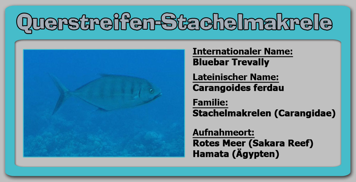 Die grundsätzlich silberfarbene Querstreifen-Stachelmakrele ist, wie der Name schon sagt, an mehreren dunkleren Querbalken an den Seiten zu erkennen. Die Schwanzflosse ist stark gegabelt und zeigt schwarze Ränder an den Enden. Wie alle Stachelmakrelen verfügt die Querstreifen-Stachelmakrele auch über die typischen langgezogenen und gebogenen Brustflossen, die wie Ruder aussehen.