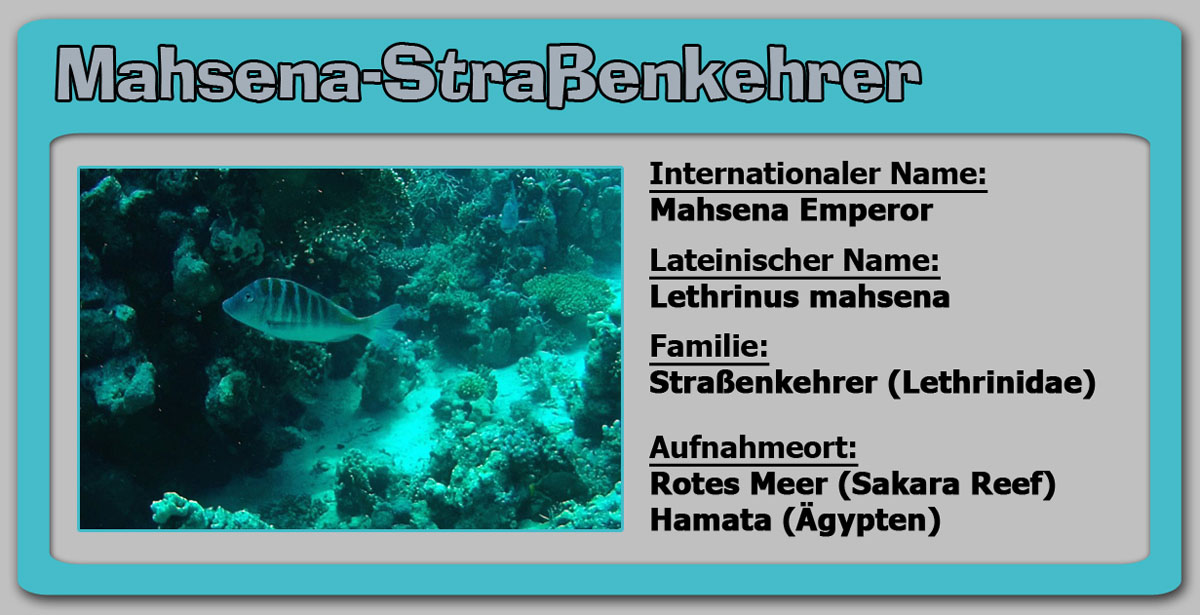 Ausgehend vom Rücken verfügt der Fisch über einige unterschiedlich breite gelb-grüne oder braune Querbänder, die schwanzwärts in ihrer Intensität nachlassen. Die Flossenspitzen können zudem rotgefärbt sein.
