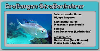 Großaugen-Straßenkehrer können bis zu 60 cm groß werden. Ihre Grundfarbe ist bläulich silberfarben mit abnehmender Intensität bauchwärts. Die Lippen dieses Fisches können zudem auch gelblich oder rosa sein.